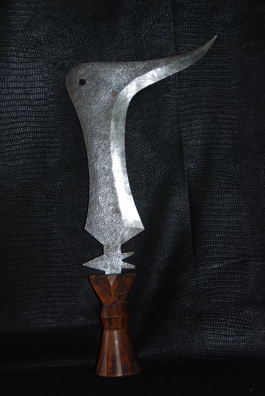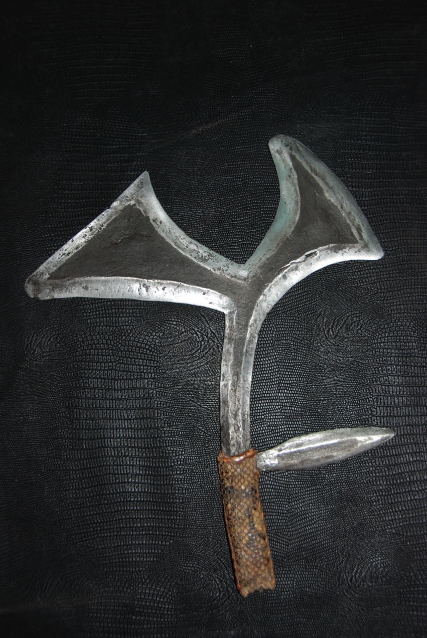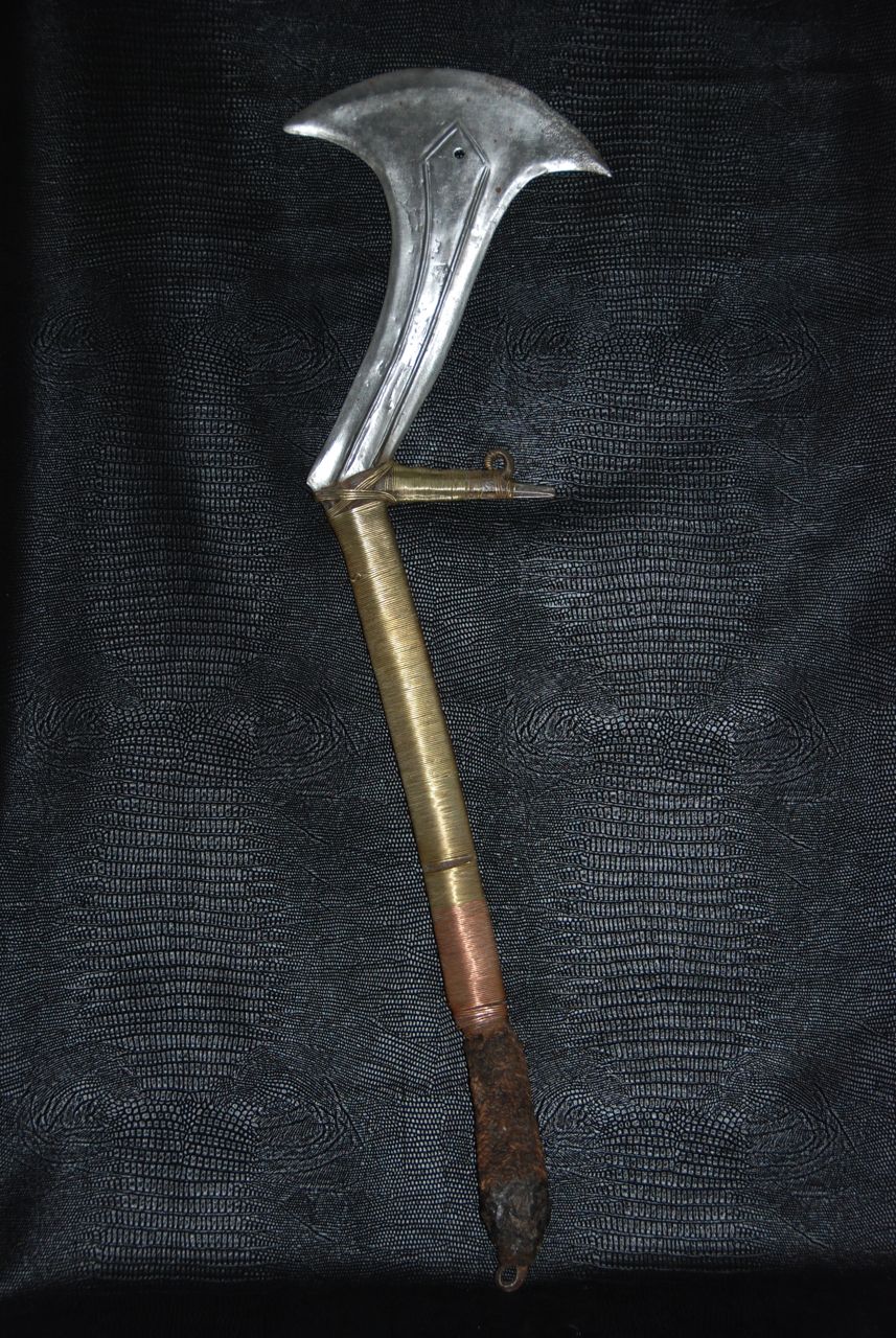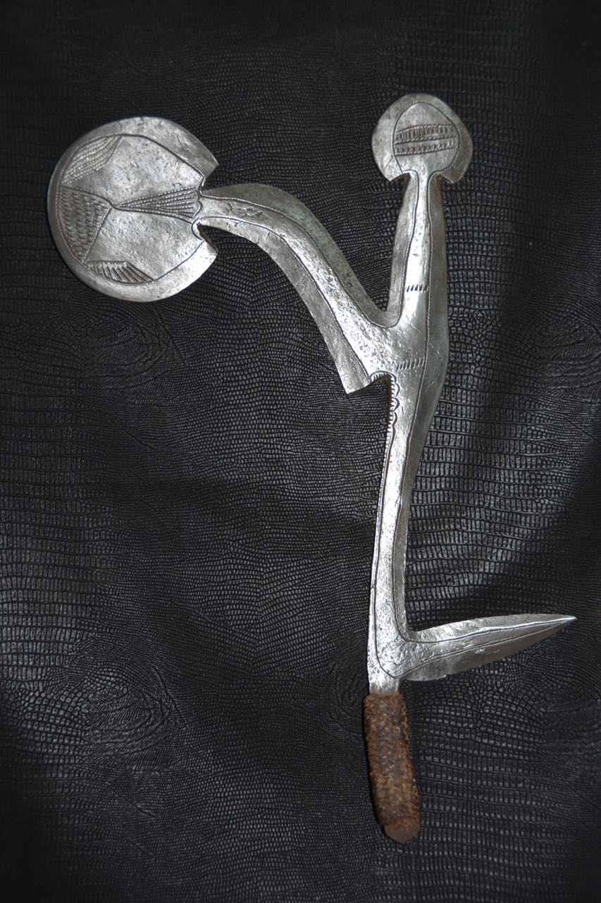 Les armes...En raison de la venue tardive des armes à feu en Afrique, les armes blanches n'ont cessé depuis des millénaires de tenir leur rôle dans la vie quotidienne. La chasse, la guerre, les exécutions, la religion, la magie, comme symbole de pouvoir ou comme monnaie. Pour les matériaux tout était sur place, les végétaux ont donné le bois des arcs, des flèches, des sagaies, des boucliers et des fourreaux. Les animaux ont fourni malgré eux l' ivoire, pour les poignées des armes, la corne, le cuir et les tendons, pour les cordes des arcs, les gaines, les boucliers et les carquois. Pour les métaux, le fer qui d'après des fouilles à Kartoum aurait été travaillé il y à plus de 2000 ans. Le bronze sur lequel ont reviendra plus tard et le cuivre qui à été largement utilisé au Zaïre qui dispose d'importants gisements de ce métal. Tout les ingrédients sont réunis. Certe! Mais il faut l'homme fondeur, celui qui coule le métal et le met en fusion et l'homme forgeron, celui qui forme le métal chauffé au rouge puis le martèle jusqu' au résultat final, parfois le forgeron fait les deux. Pour cela les forgerons étaient craints et respectés, eux qui avaient les liens directs avec la terre, le feu, l'air et l'eau. Les 4 éléments naturel source de vie. Les armes d'Afrique sont pour moi d'une beauté insensée, aux formes parfois extravagantes, mais d'une finesse extraordinaire, comme les couteaux de jets aux multiples pointes, pour un impact et une efficacité maximum,