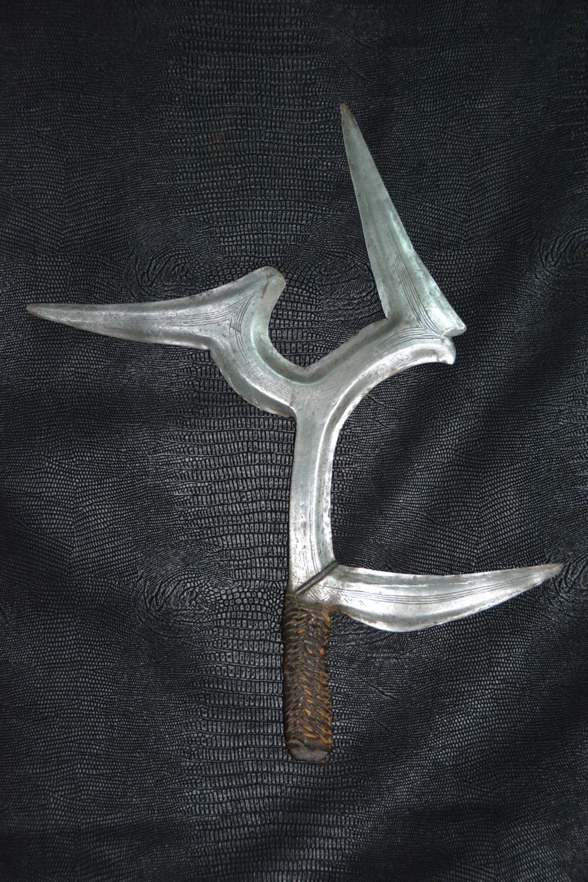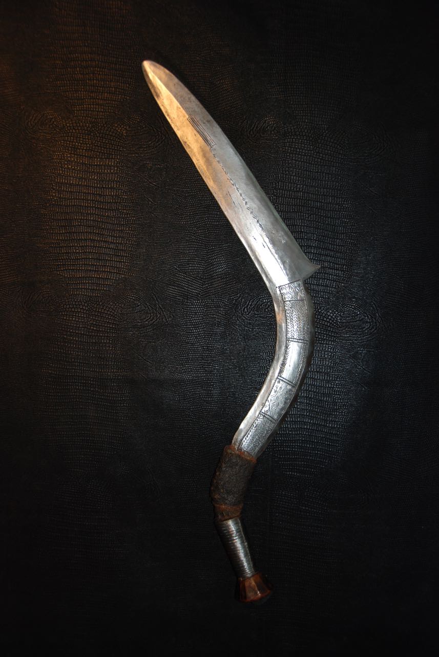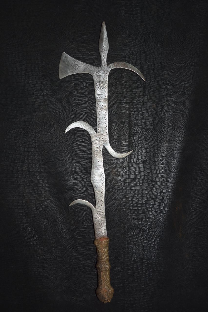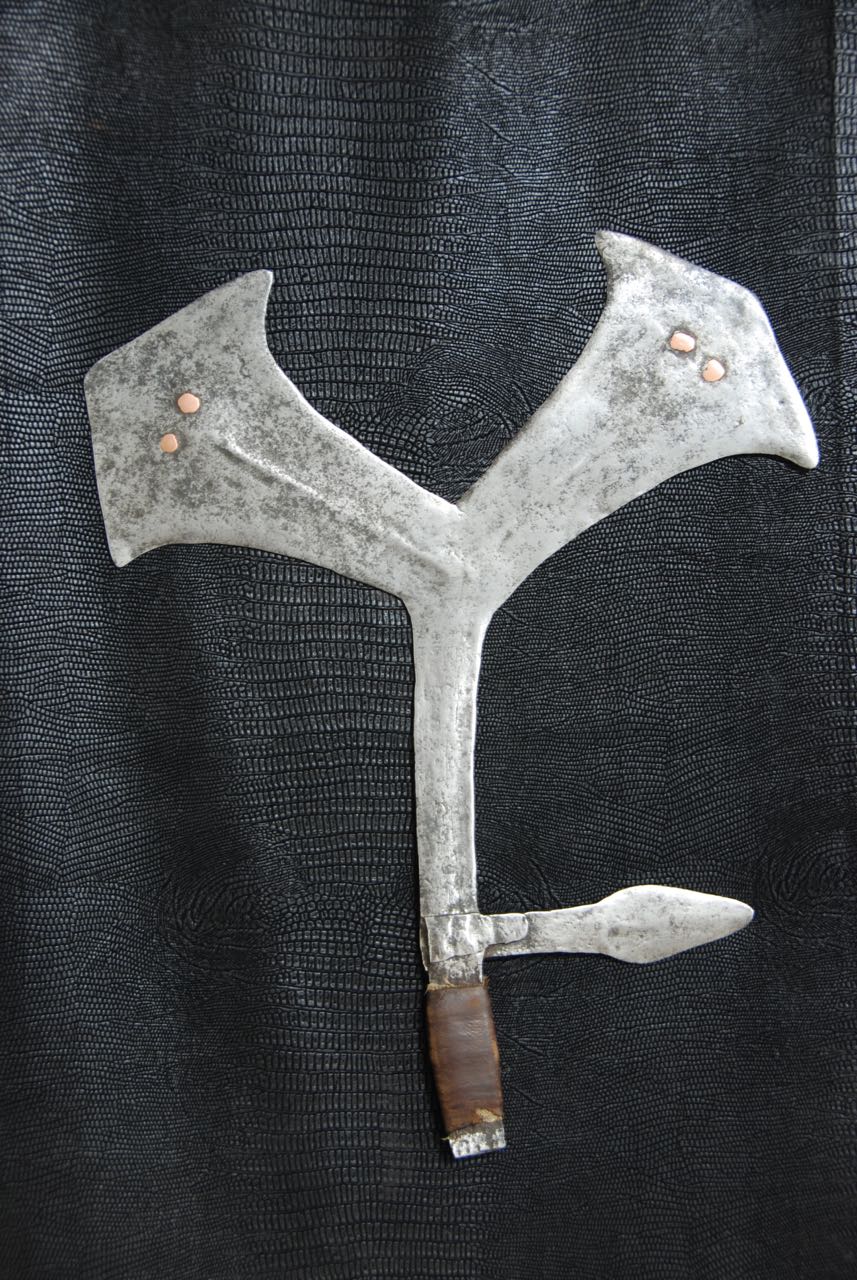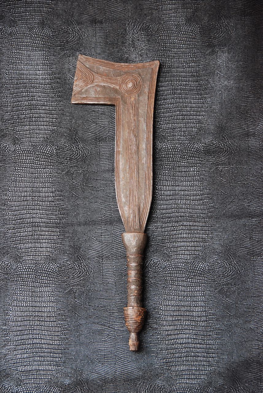 Les armes...En raison de la venue tardive des armes à feu en Afrique, les armes blanches n'ont cessé depuis des millénaires de tenir leur rôle dans la vie quotidienne. La chasse, la guerre, les exécutions, la religion, la magie, comme symbole de pouvoir ou comme monnaie. Pour les matériaux tout était sur place, les végétaux ont donné le bois des arcs, des flèches, des sagaies, des boucliers et des fourreaux. Les animaux ont fourni malgré eux l' ivoire, pour les poignées des armes, la corne, le cuir et les tendons, pour les cordes des arcs, les gaines, les boucliers et les carquois. Pour les métaux, le fer qui d'après des fouilles à Kartoum aurait été travaillé il y à plus de 2000 ans. Le bronze sur lequel ont reviendra plus tard et le cuivre qui à été largement utilisé au Zaïre qui dispose d'importants gisements de ce métal. Tout les ingrédients sont réunis. Certe! Mais il faut l'homme fondeur, celui qui coule le métal et le met en fusion et l'homme forgeron, celui qui forme le métal chauffé au rouge puis le martèle jusqu' au résultat final, parfois le forgeron fait les deux. Pour cela les forgerons étaient craints et respectés, eux qui avaient les liens directs avec la terre, le feu, l'air et l'eau. Les 4 éléments naturel source de vie. Les armes d'Afrique sont pour moi d'une beauté insensée, aux formes parfois extravagantes, mais d'une finesse extraordinaire, comme les couteaux de jets aux multiples pointes, pour un impact et une efficacité maximum,