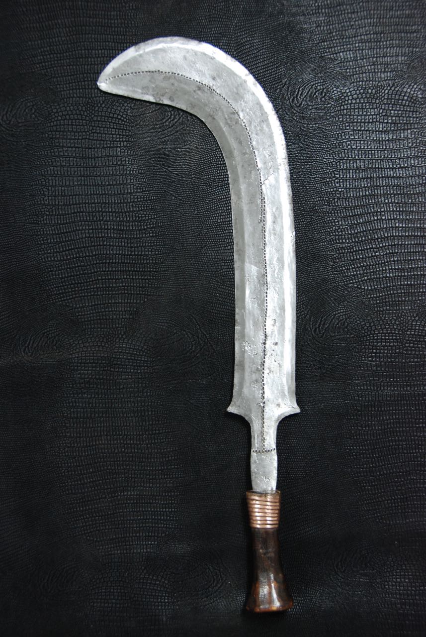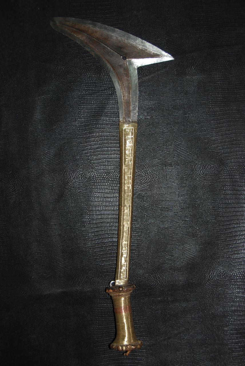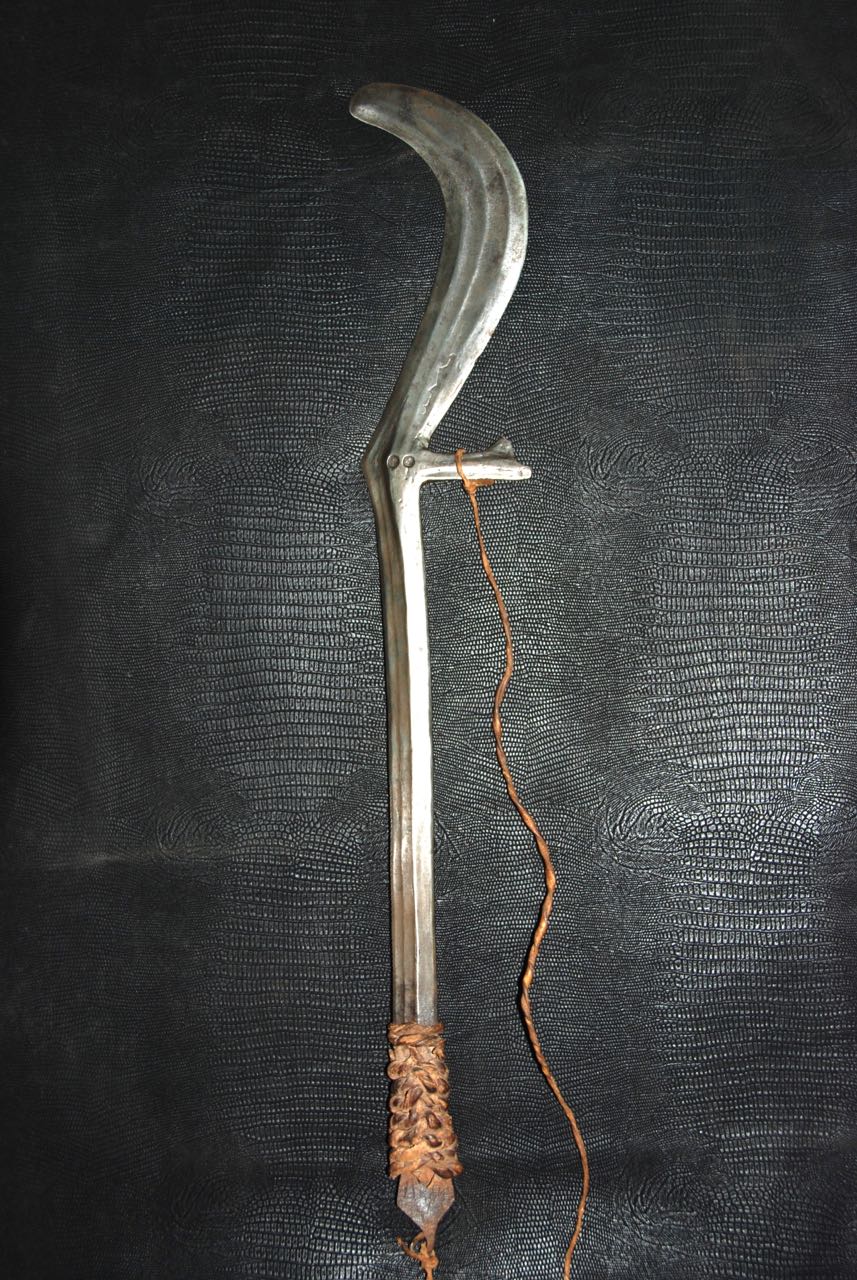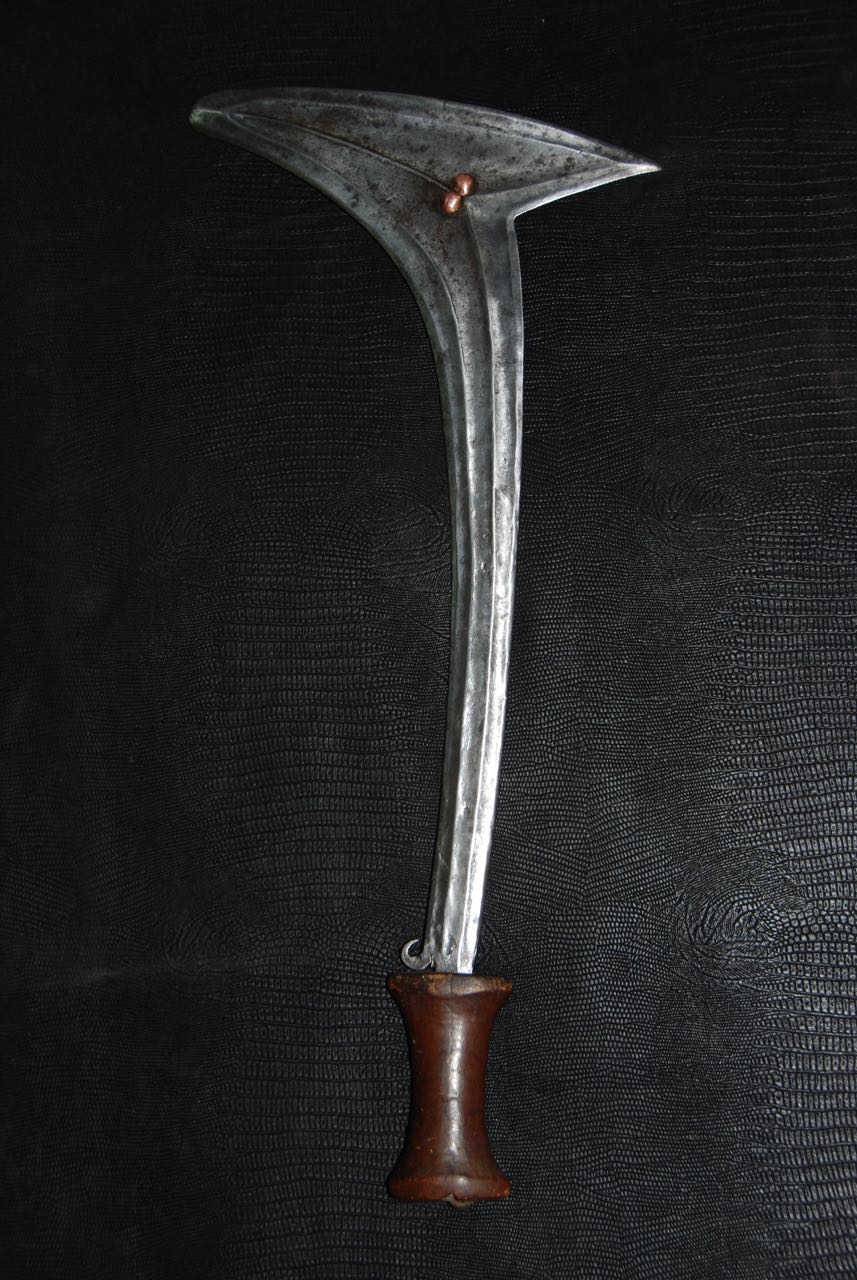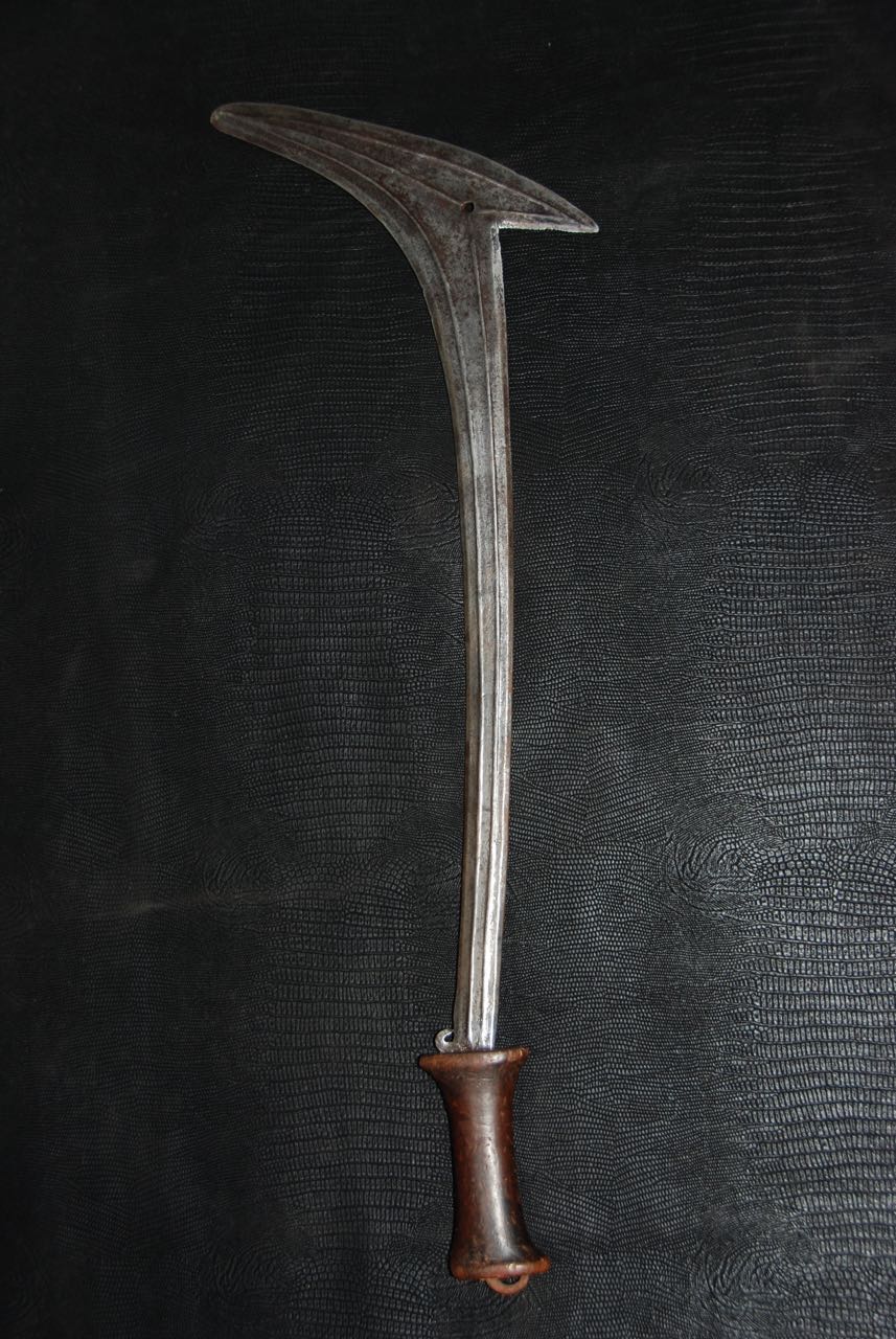 (...) on peut considérer trois groupes dans les couteaux faucilles.Deuxième groupeUn deuxième groupe est composé d’armes dites faucilles venant du nord-est de la R.D. du Congo « anciennement Zaïre » qui regroupe des armes plus courtes avec une poignée généralement plus longue.