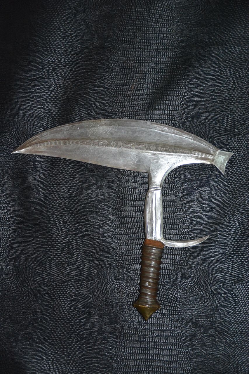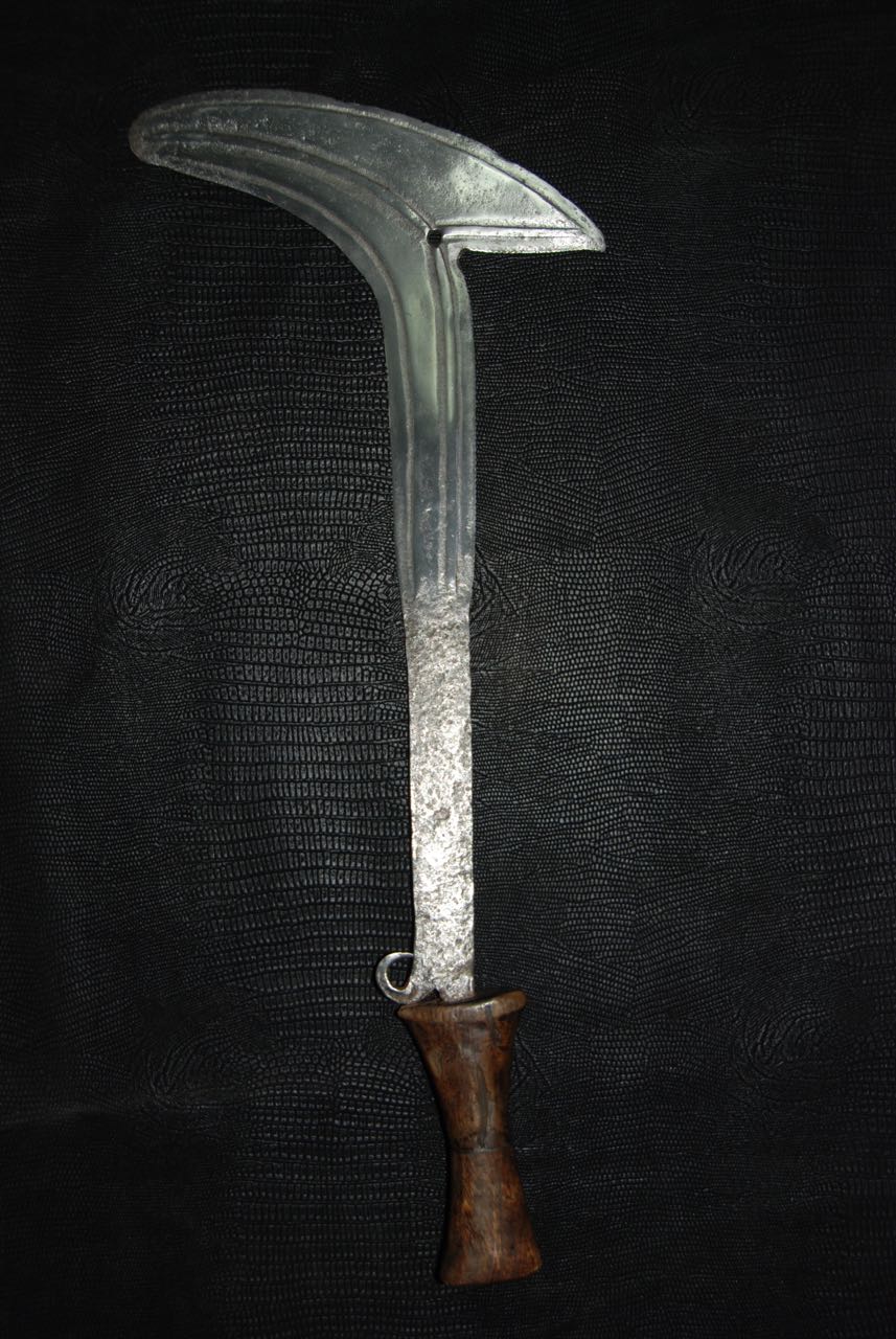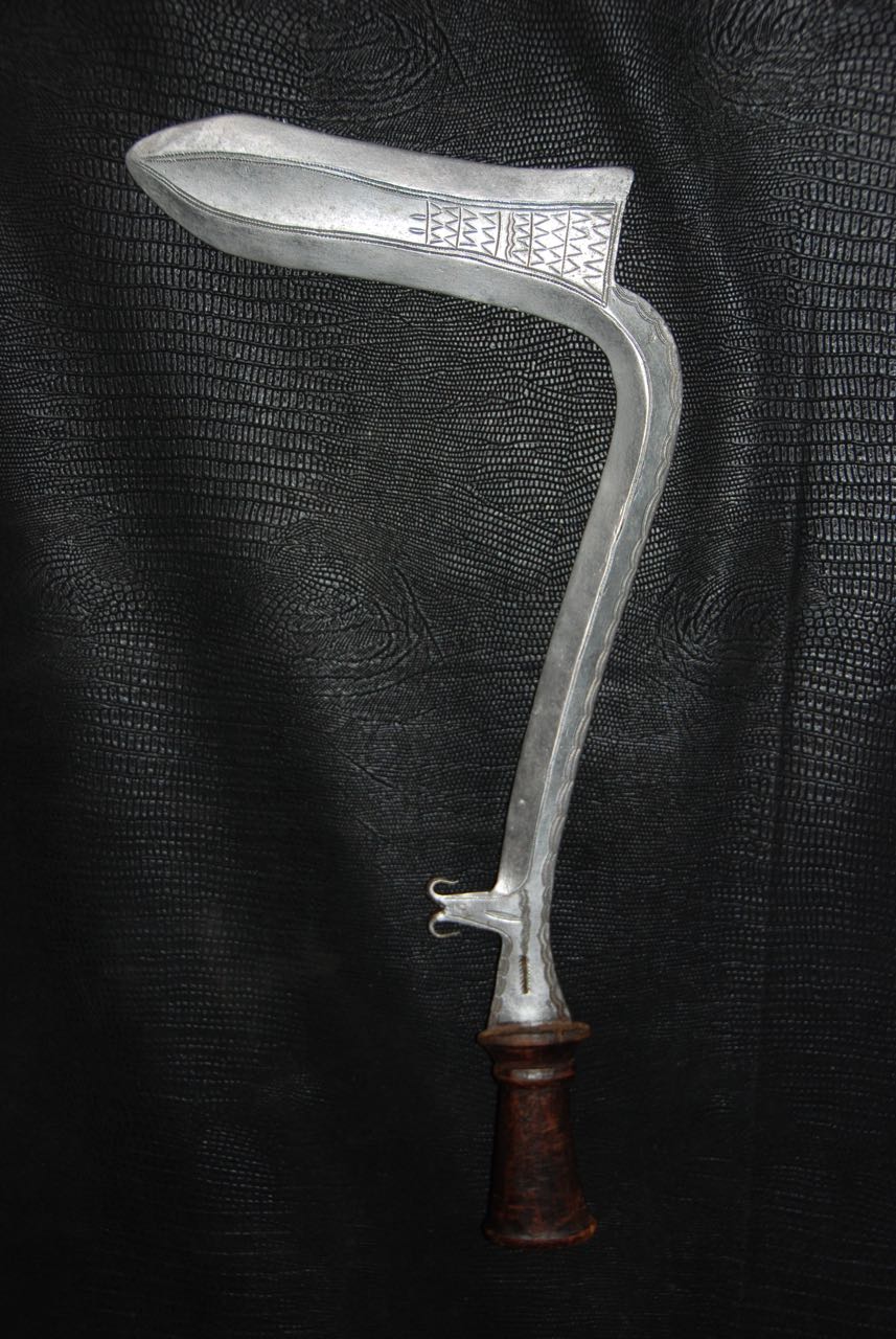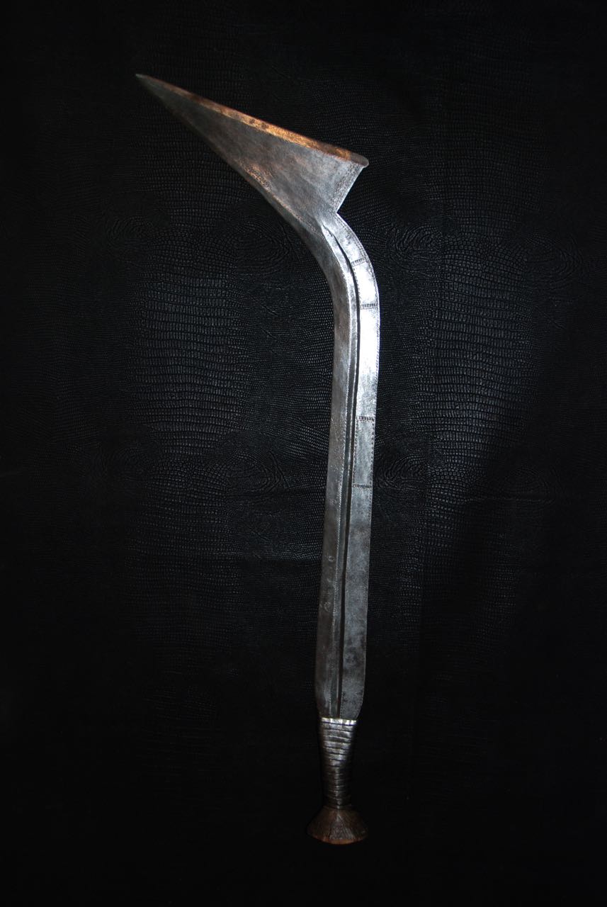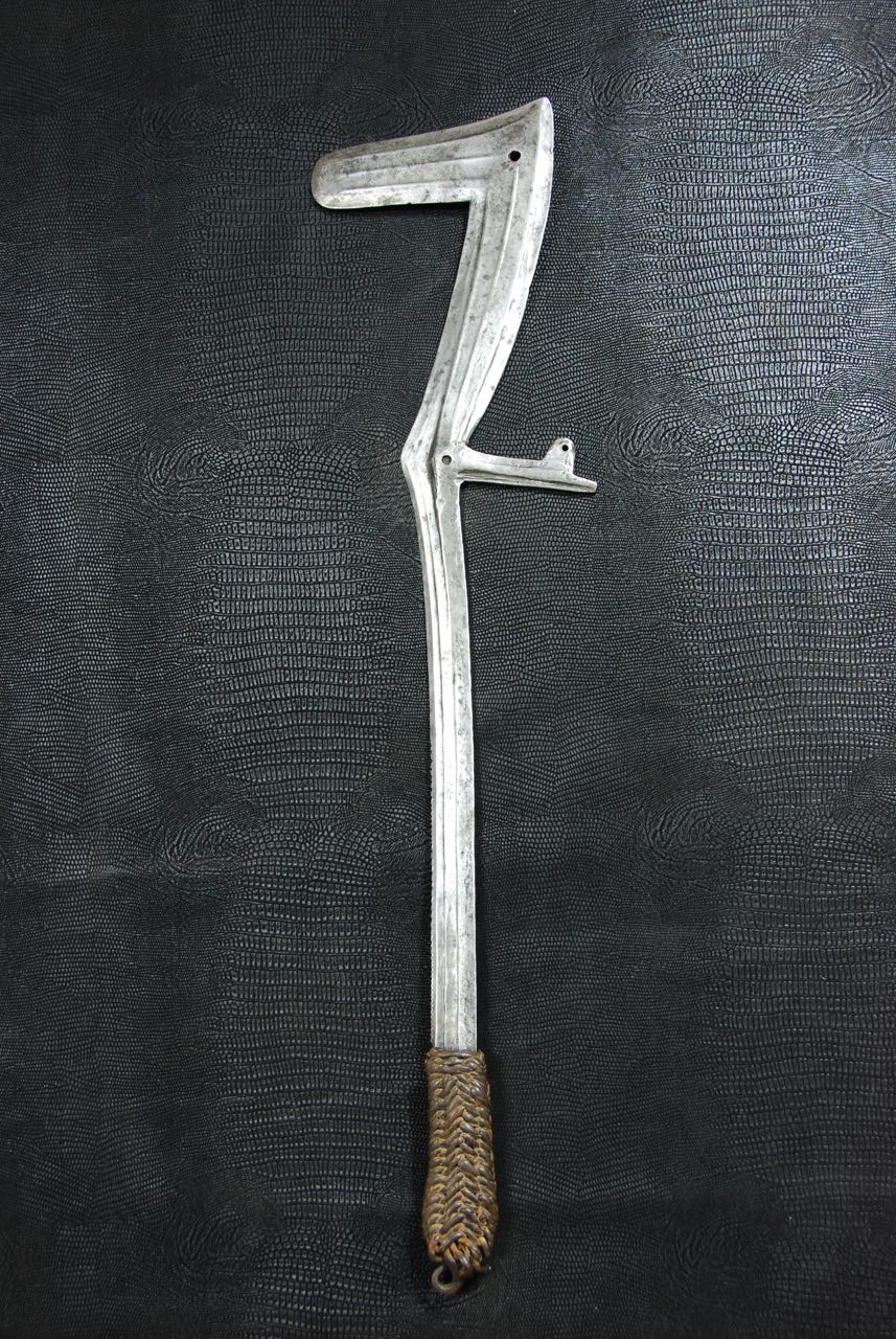(...) on peut considérer trois groupes dans les couteaux faucilles.Deuxième groupeUn deuxième groupe est composé d’armes dites faucilles venant du nord-est de la R.D. du Congo « anciennement Zaïre » qui regroupe des armes plus courtes avec une poignée généralement plus longue.