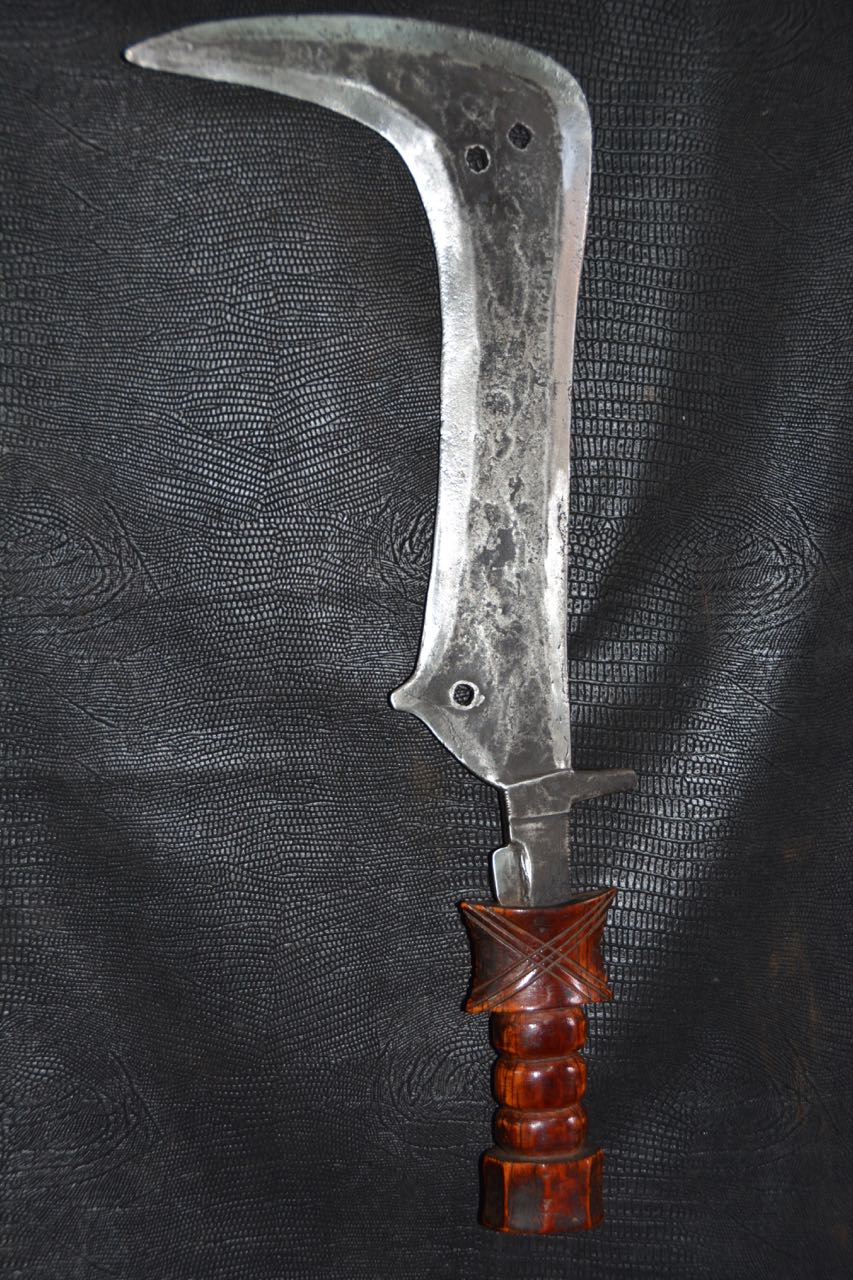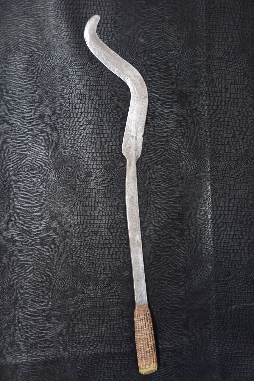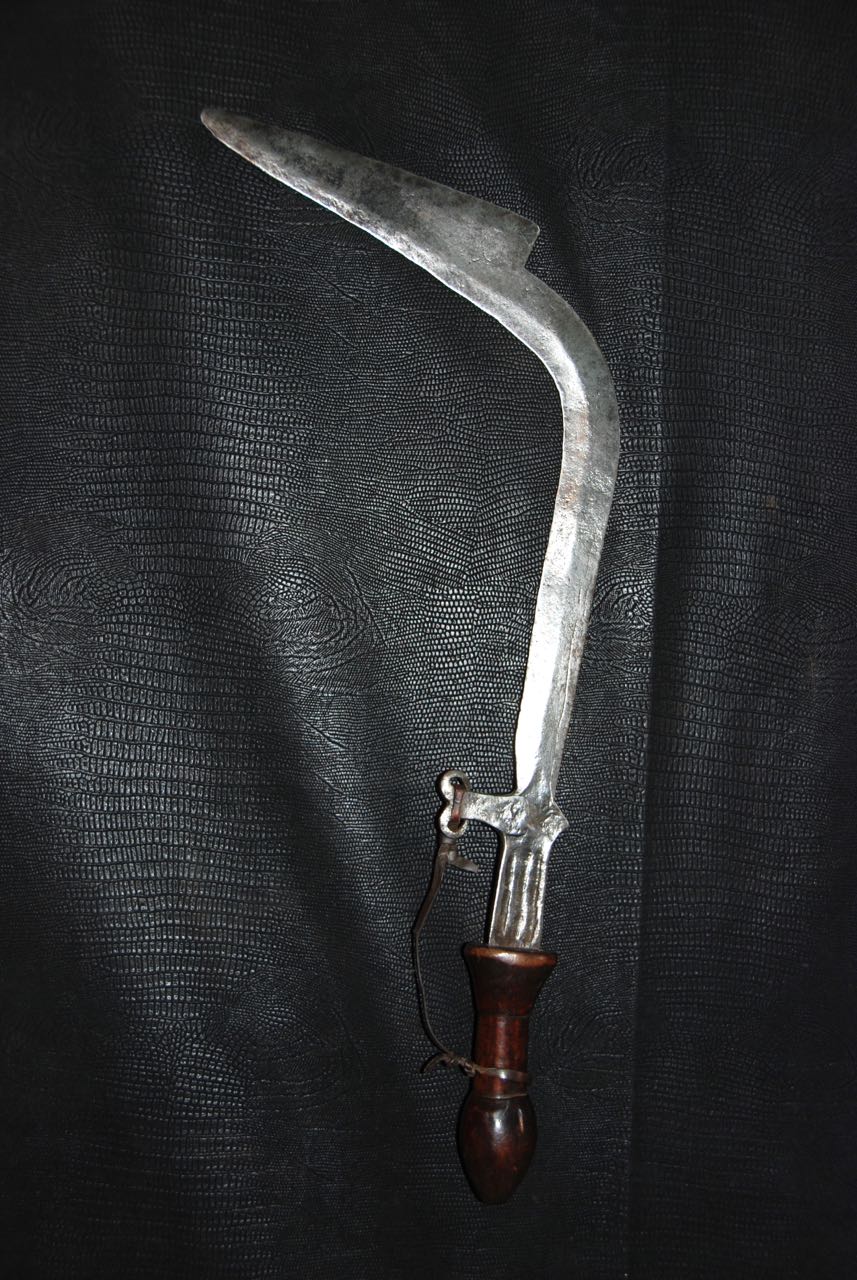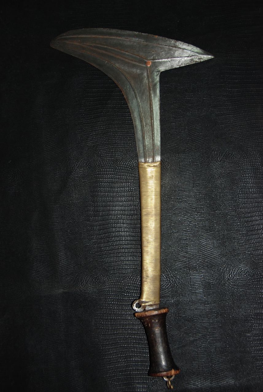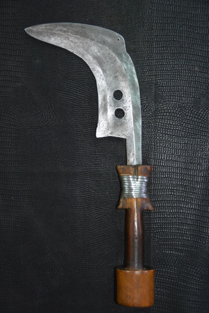 (...) on peut considérer trois groupes dans les couteaux faucilles.Deuxième groupeUn deuxième groupe est composé d’armes dites faucilles venant du nord-est de la R.D. du Congo « anciennement Zaïre » qui regroupe des armes plus courtes avec une poignée généralement plus longue.
