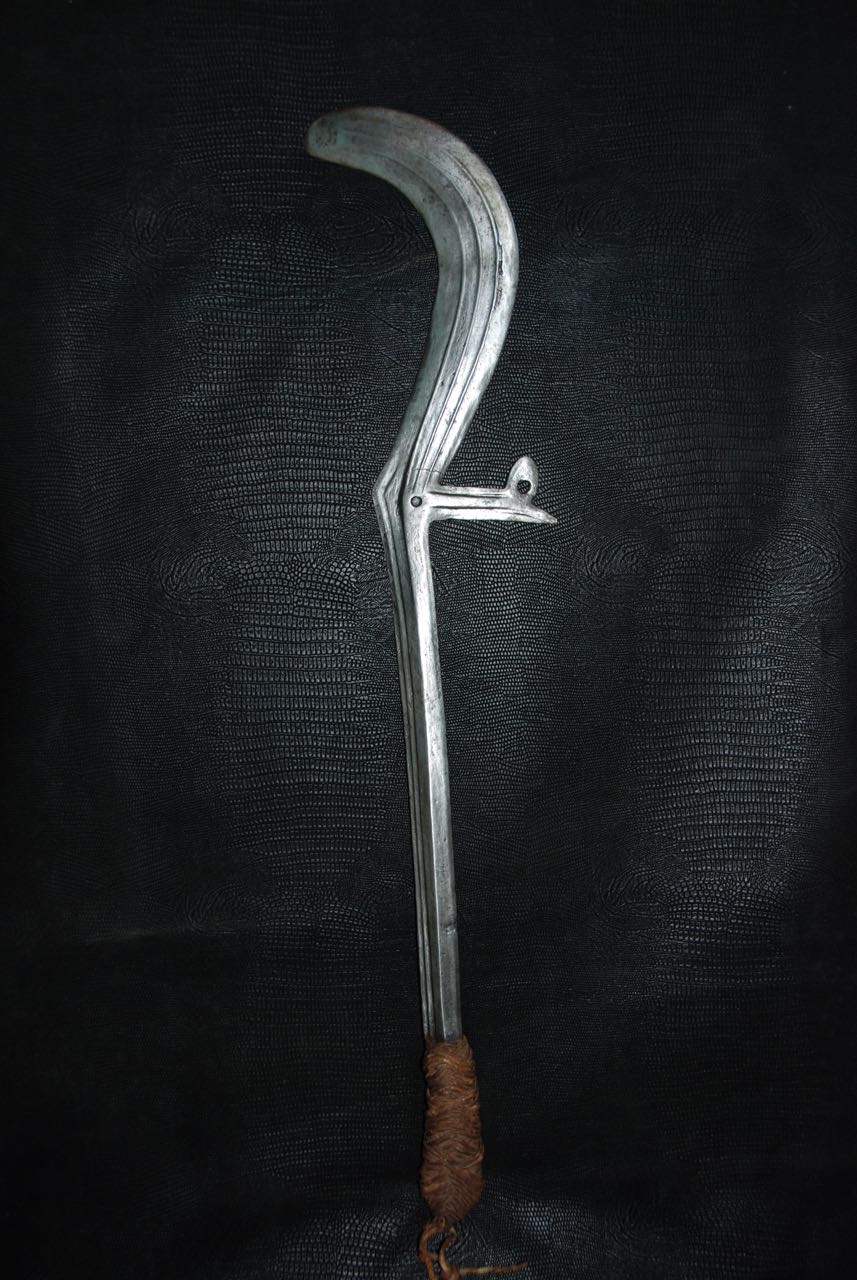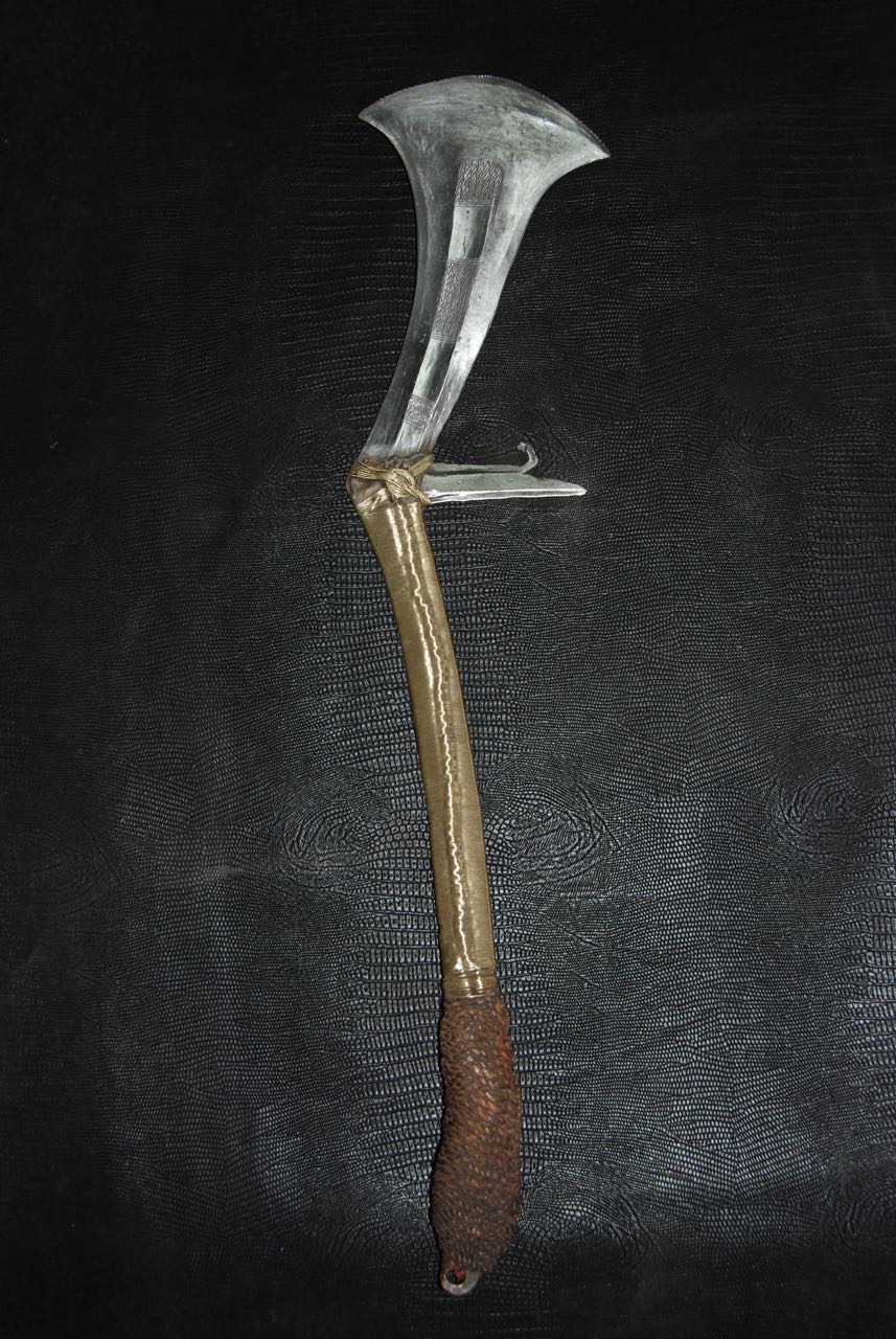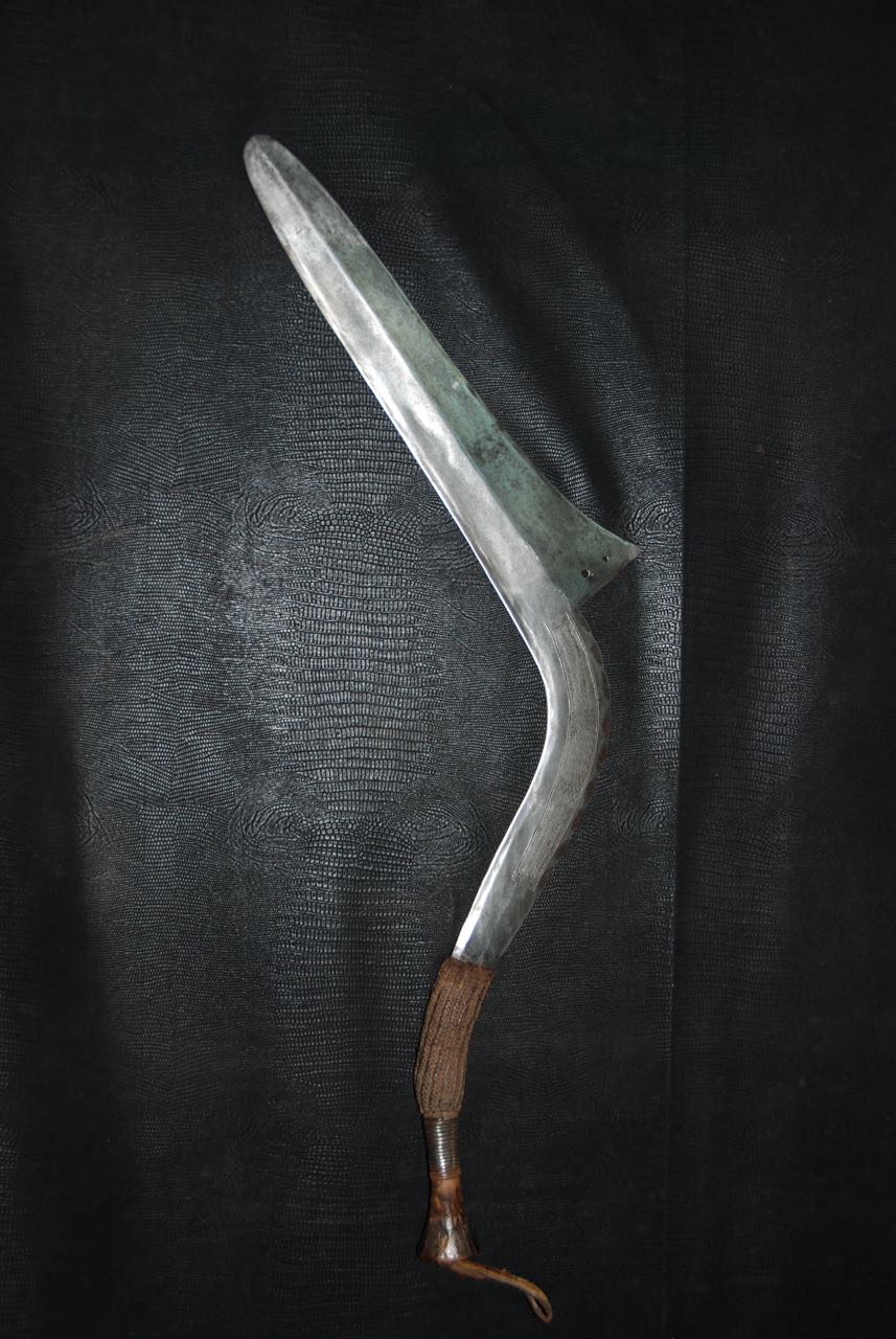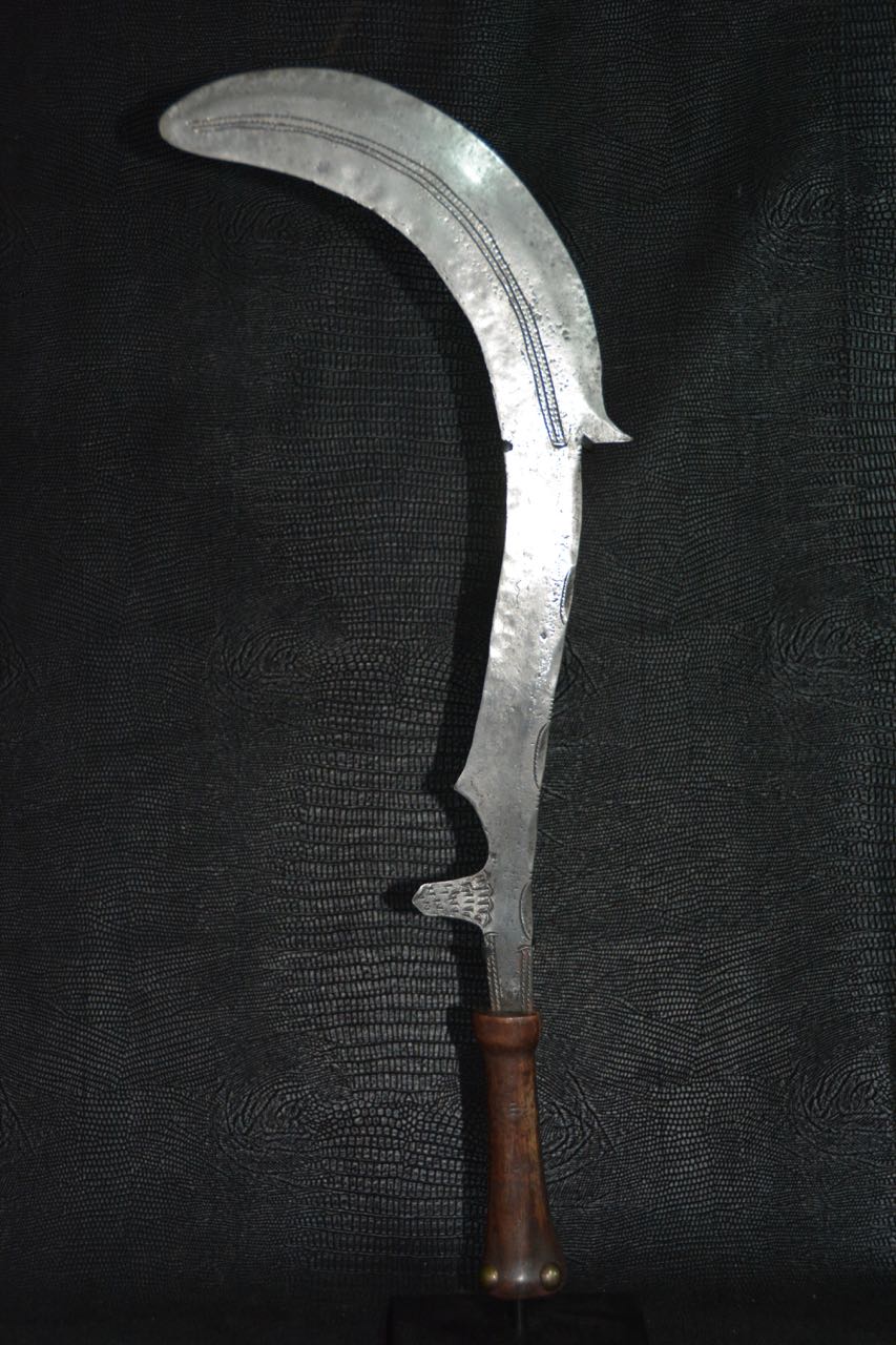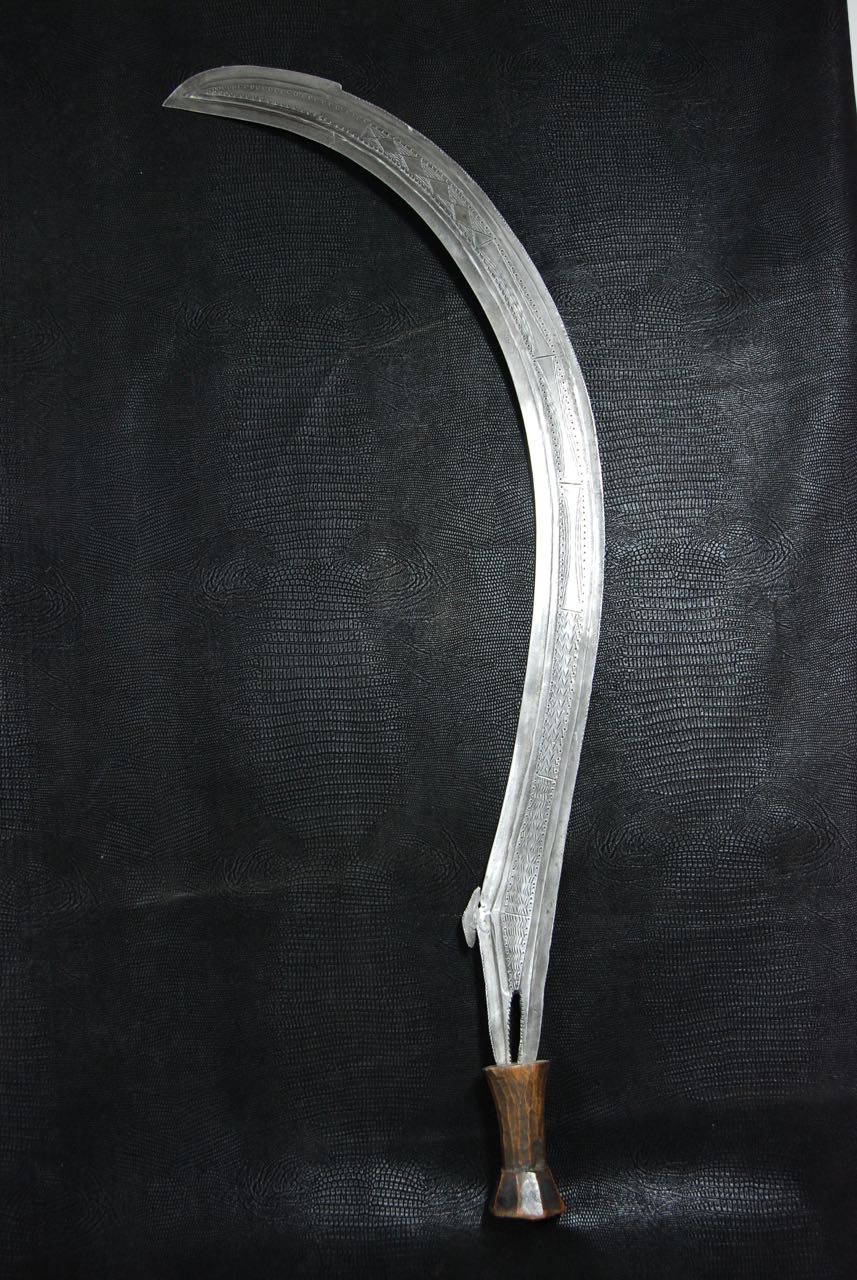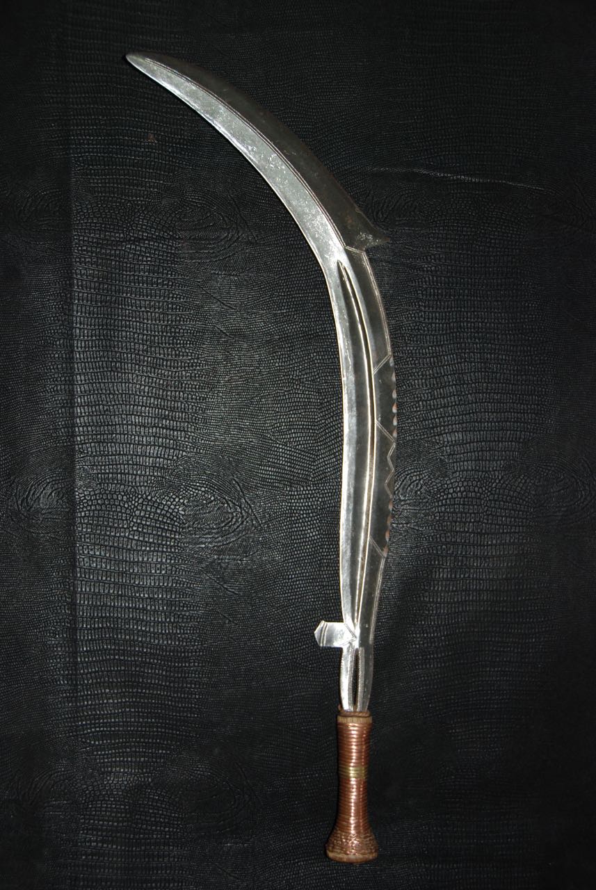 (...) on peut considérer trois groupes dans les couteaux faucilles.Deuxième groupeUn deuxième groupe est composé d’armes dites faucilles venant du nord-est de la R.D. du Congo « anciennement Zaïre » qui regroupe des armes plus courtes avec une poignée généralement plus longue.
