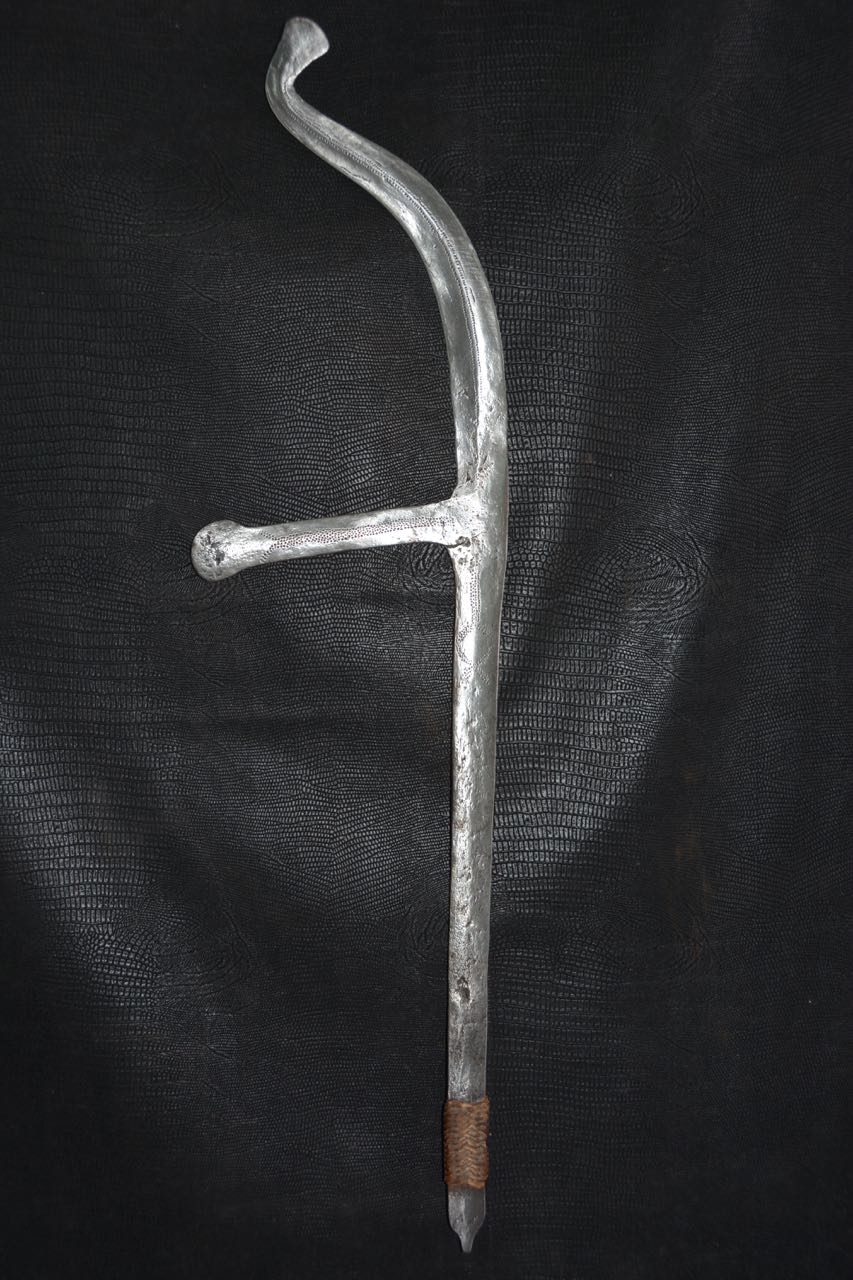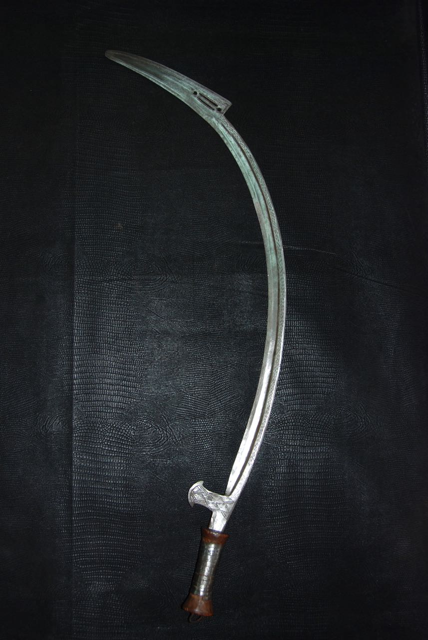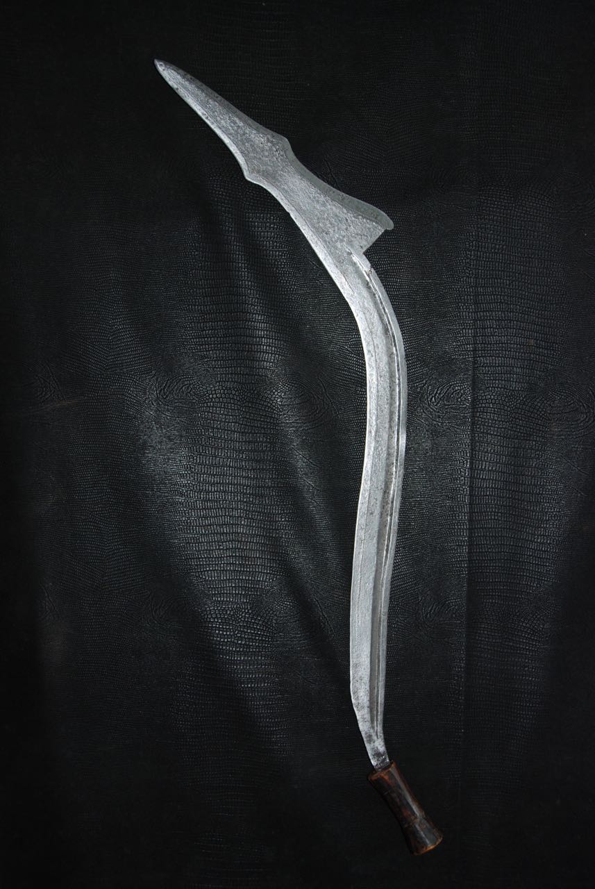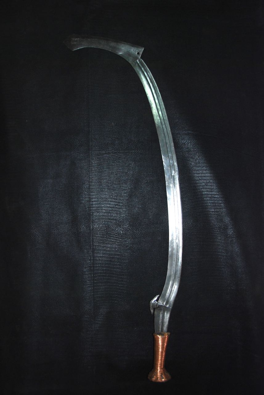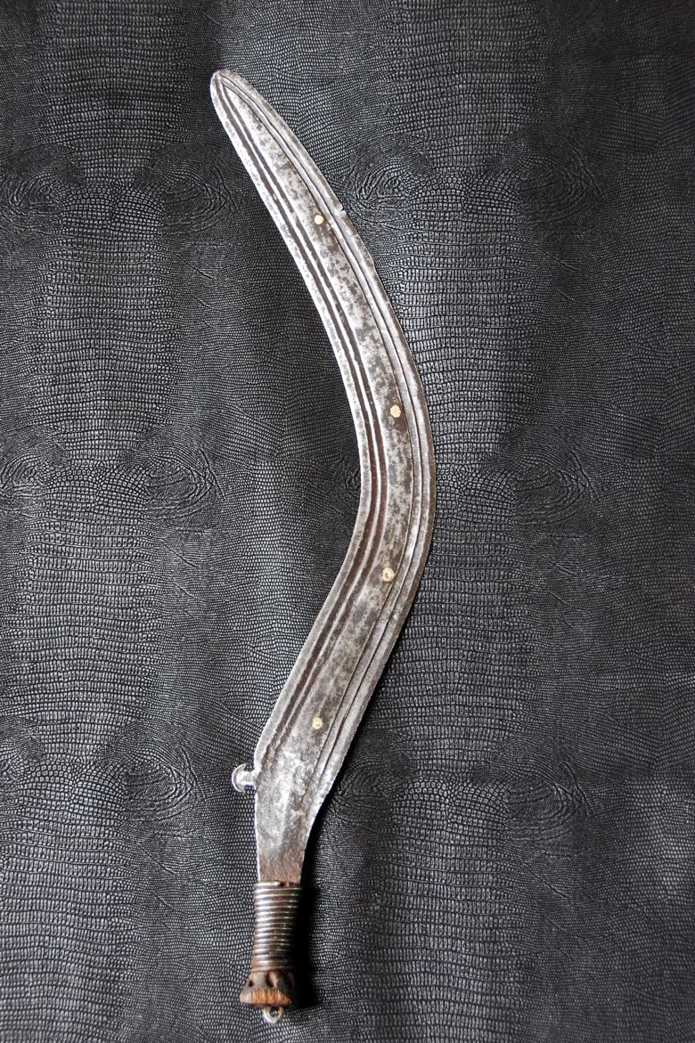 (...) on peut considérer trois groupes dans les couteaux faucilles.Deuxième groupeUn deuxième groupe est composé d’armes dites faucilles venant du nord-est de la R.D. du Congo « anciennement Zaïre » qui regroupe des armes plus courtes avec une poignée généralement plus longue.