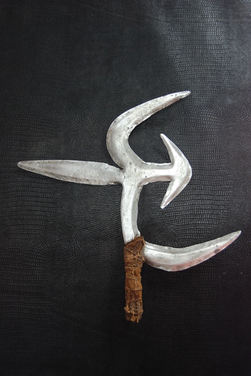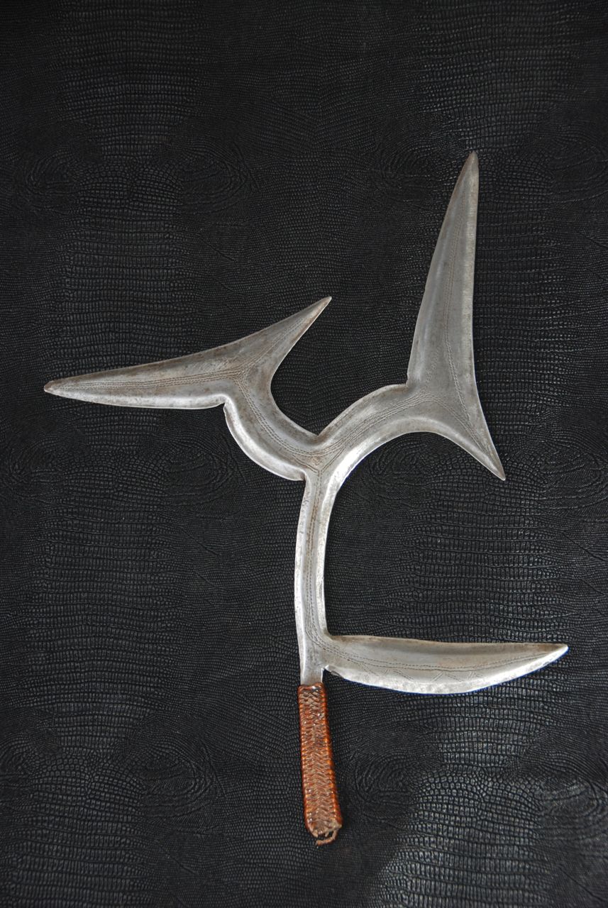 LES COUTEAUX DE JET.Par ses multitudes de formes incurvées et agressives, le couteau de jet joui d'une place particulière parmi les armes Africaine. ![]() Comme son nom l'indique, il est fait pour être lancé, il est efficace jusqu'à une trentaine de mètres aussi bien pour la chasse que pour la guerre. Peu à peu les couteaux de jet sont devenus des objets de prestige, voir des monnaies. Le dos du couteau est en général plat alors que l'autre face est en relief avec des décors gravés sur l'axe médian des différente lames. Il en existe également sans décor. Quand on voit un couteaux de jet on a aucun doute sur sa fonction première qui était de tuer la proie. Mais quelle finesse dans la beauté de ces armes à plusieurs lames acérées et multidirectionnelles. Le manche est toujours couvert de cuir, fibres végétales, peaux, tissus, métal en bandelette "cuivre ou laiton". Parfois en ivoire pour les couteaux de dignitaire, prestige oblige. Elles nous viennent souvent d'Afrique centrale, des régions de savane, il est évident que dans les bois et forêts ils n'en avaient pas besoin. Les premiers Européens qui ont abordé l’espace centrafricain ont été des collecteurs de couteaux de jet entre autres et de harpes. L’intérêt que suscitent les objets de métal est de motivation variable, souvent limitée à des spécialistes ou collectionneurs amateurs mais cela conduit rarement à une réflexion d’ensemble permettant de ce rendre compte de l’importance culturelle du patrimoine de la métallurgie du fer en Afrique. Certains observateurs ont, dès le 19ème siècle relevé l’importance de ce patrimoine. Voici par ces deux témoignages la précision que je voulais mettre en valeur, qui nous fait comprendre la valeur culturelle de ces armes, l’ingéniosité et la capacité de ces fantastiques forgerons, ouvriers inconnus dans leurs arts. Bonne promenade parmi les couteaux de jet. Allan R. |
